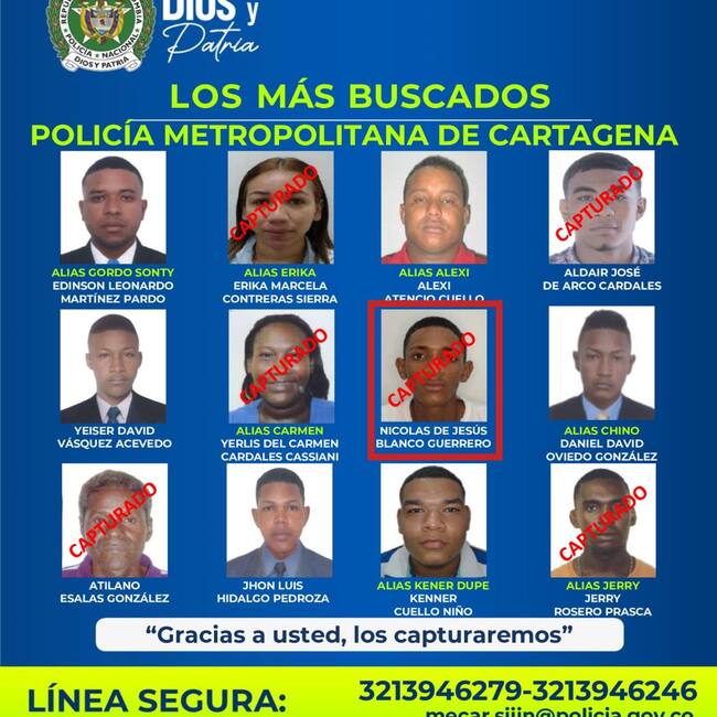 La captura del sexto integrante del Cartel de los Más Buscados, fue realizada por policías de la Seccional de Investigación Criminal, en el sector La Perimetral, quien es solicitado por el delito de homicidio agravado, por el Juzgado Décimo Penal Municipal con Funciones de Garantías, bajo la coordinación de la Fiscalía 16 Especializada de Cartagena.