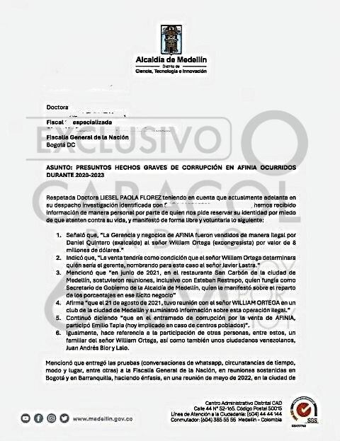 Según ha confirmado Caracol Radio, Federico Gutiérrez, y el gerente general del Grupo EPM, John Maya Salazar recibieron información directa y personal de parte de un testigo que sostiene que la gerencia y varios negocios de Afinia habrían sido vendidos, de manera ilegal, por el entonces alcalde de Medellín, Daniel Quintero, al excongresista William Ortega, y que el valor de la transacción ilegítima alcanzaría el monto de los 8 millones de dólares.