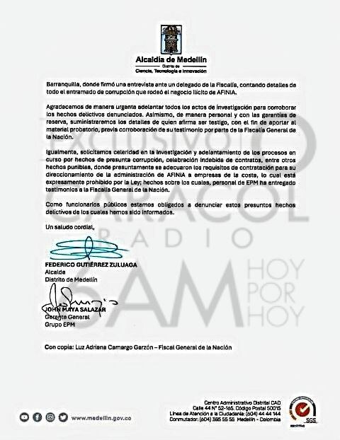 El alcalde de Medellín y el gerente del Grupo EPM, enterados de la situación, se han dirigido formalmente a la Fiscalía, para que informe el estado de la investigación que la entidad sigue tras los testimonios en cuestión de esta persona que no es identificada, porque teme por su vida.