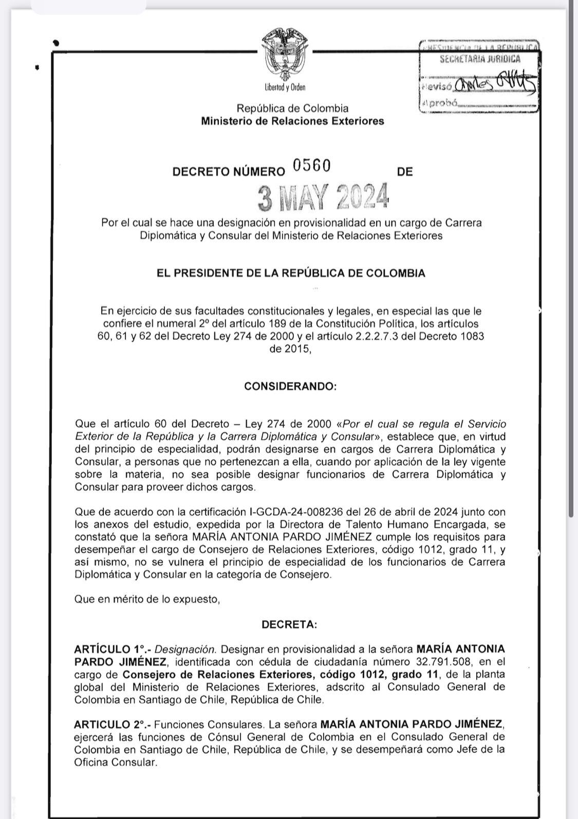 Tal como se había anunciado en Caracol Radio, María Antonia Pardo también recibió el decreto a través del cuál oficializan su llegada al cargo de cónsul de Colombia en Chile.