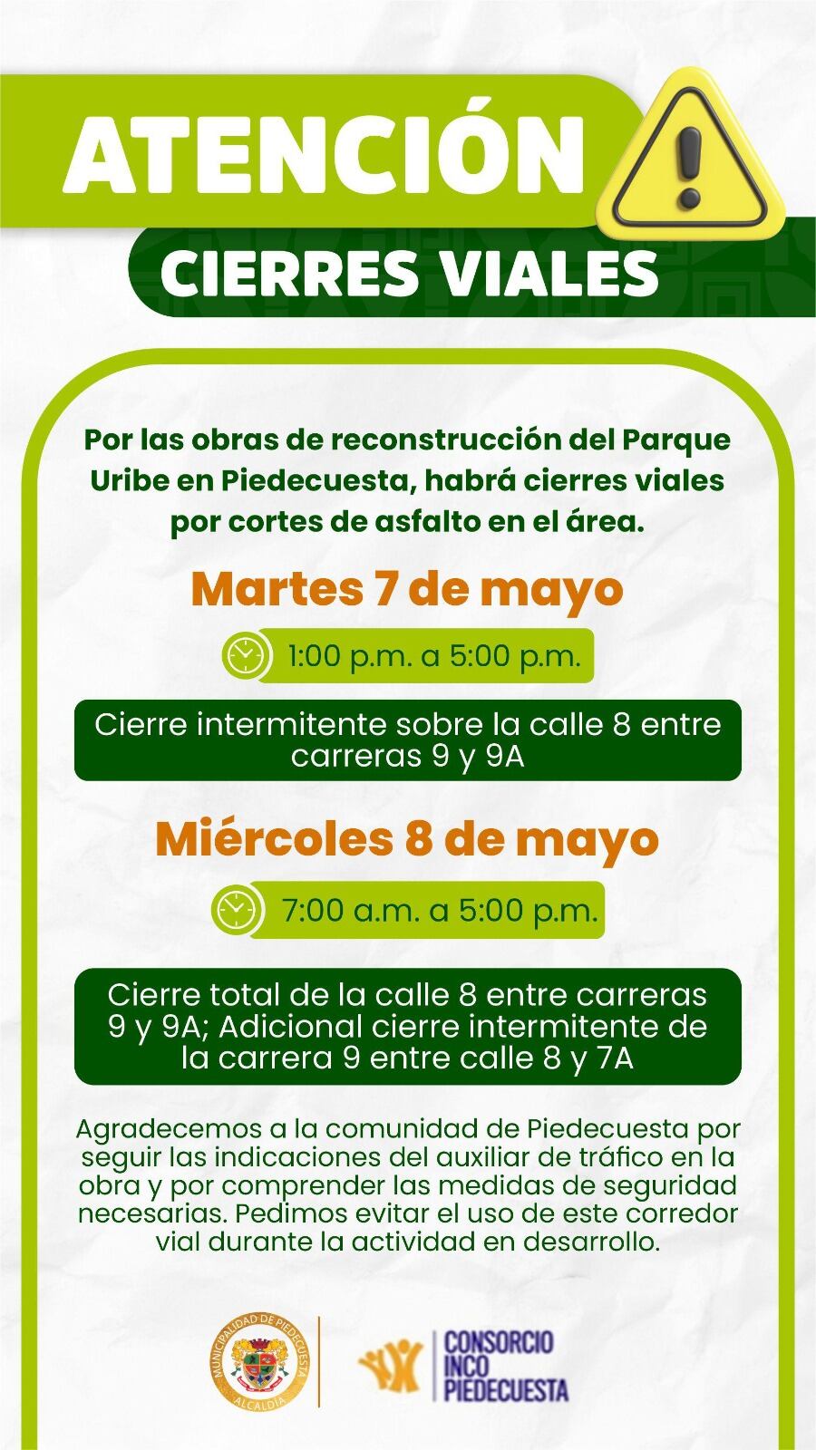 El consorcio Inco, el cual realiza la reconstrucción del parque Uribe del municipio de Piedecuesta, comunicó de varios cierres viales en los alrededores del parque durante este martes y miércoles.