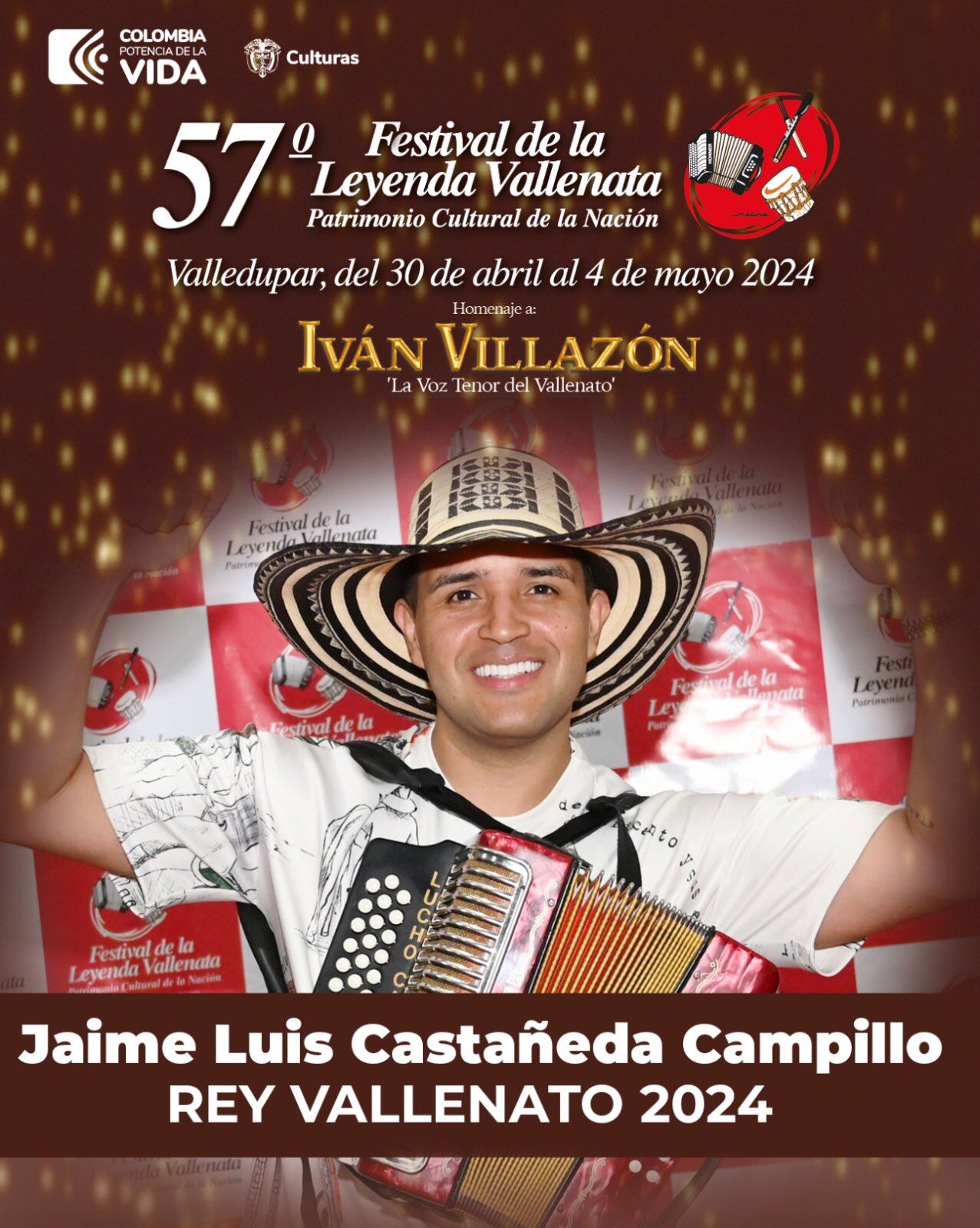 JAIME LUIS CAMPILLO La noche del sábado 4 de mayo de 2024 recibió el galardón que luchó de principio a fin: REY VALLENATO 2024 de la Versión número 57 del Festival de la Leyenda Vallenata, el cual fue en homenaje a ‘La Voz Tenor del Vallenato’, Iván Villazón.