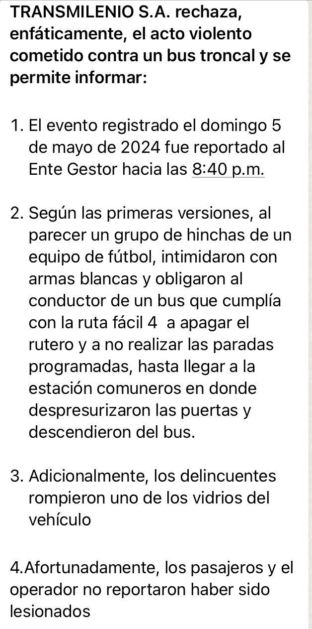Desde Transmilenio, mediante un comunicado explicaron lo ocurrido y rechazaron los actos de violencia que se presentaron en la troncal NQS. Además del comunicado, la Policía informó que los responsables de estos hechos serían todos seguidores del Deportes Tolima y que en este momento son buscados.