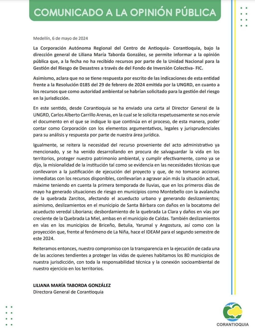 La Corporación Autónoma Regional del Centro de Antioquia - Corantioquia, hizo la solicitud a la Unidad Nacional para la Gestión del Riesgo de Desastres (UNGRD) mediante una carta oficial enviada al señor Carlos Carrillo, director de la entidad. En la misiva, la entidad le reiteró que en ningún momento ha recibido recursos de parte de ellos.