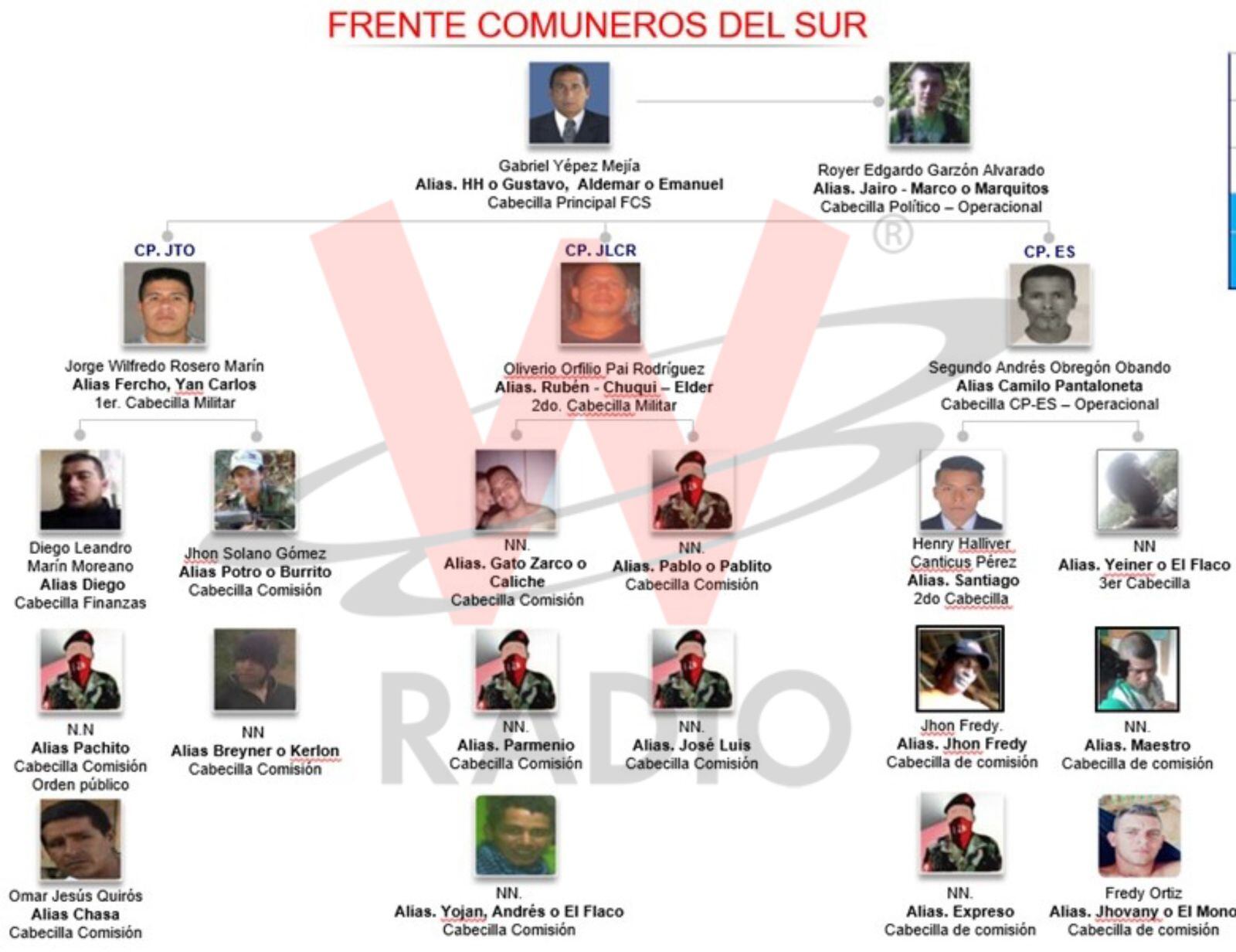 - “La Estructura Comuneros del sur ha estado muy ligada, especialmente en estos últimos años, con actividades de narcotráfico, extorsión y explotación ilícita de yacimientos mineros. Estas acciones le han permitido fortalecer sus redes logísticas y sus finanzas ilegales, lo que se ha traducido en el mejoramiento del equipamiento para sus estructuras armadas, mediante la adquisición de material bélico y, de igual forma, afianzar en el territorio sus redes de apoyo que, finalmente, les permitiría tener el control ilegal de área, para mantener así el dominio de las economías ilícitas que se desarrollan en la región”.