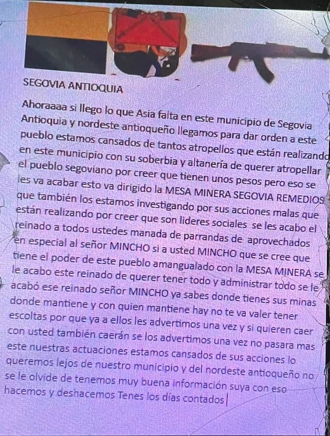 “Antier sale un panfleto donde lo amenazan a él y a la Mesa Minera diciéndole, pues, que se acaba la alcahuetería en el territorio que ya lo tienen ubicado y lo ponen como en sobre aviso, por decirlo digamos, lo que es uno de los modos operandi que se ha visto aquí en el territorio que empiezan a sacar panfleto y amenazar a la gente, los líderes sociales o la gente que de alguna otra manera está reclamando sus derechos, eso es típico acá en la región”, aseguró.
