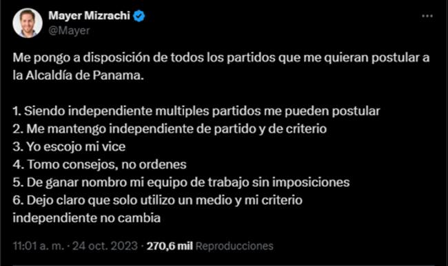 Según Mayer, él no decidió con quién correr para la Alcaldía de la capital. Mayer hizo “algo que nunca se había hecho”: ponerse a disposición a través de una publicación en X (antes, Twitter). En esta, definió los valores y los términos bajo los cuales participaba. Se puso a disposición de todos los partidos políticos. “Donde me violen cualquiera de los términos, yo no dudo en divorciarme de los partidos y de quien me postule”.
