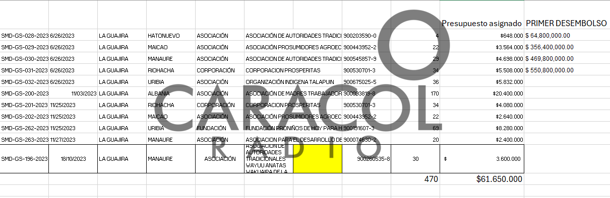 En Caracol Radio hemos solicitado a la Fiduprevisora que informe sobre los desembolsos del dinero a las ollas contratadas en La Guajira. Hasta el momento solo aparece el documento del dinero.