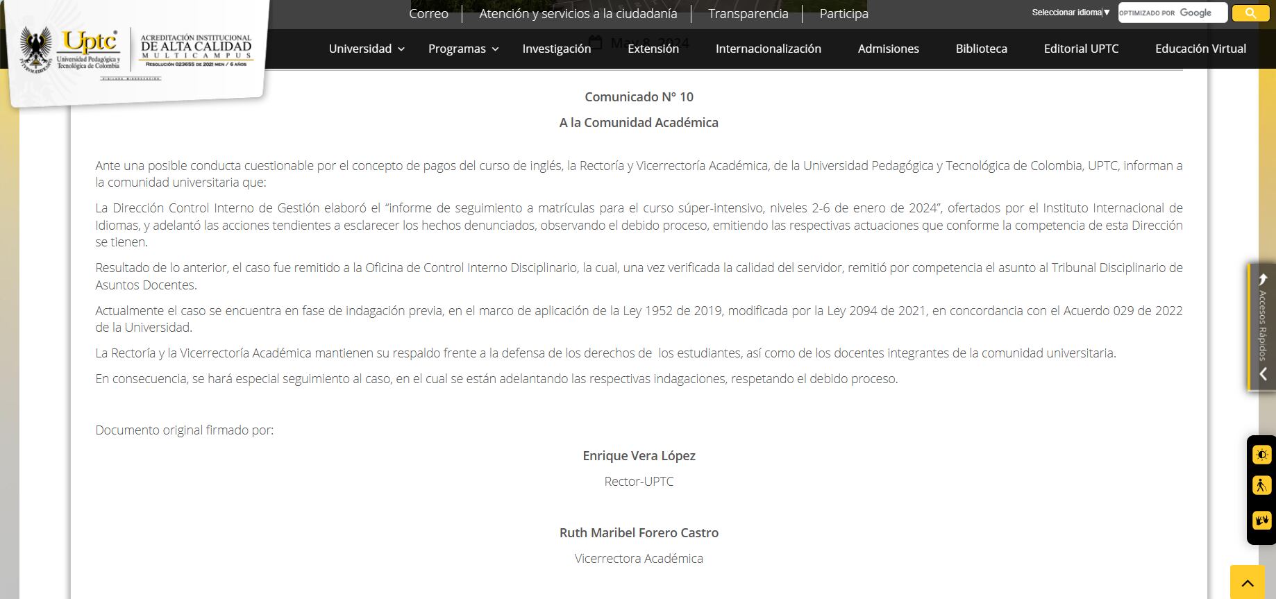 Ante la investigación revelada por Caracol Radio, sobre el cobro que está haciendo el director del Instituto Internacional de Idiomas de la Universidad Pedagógica y Tecnológica de Colombia, Alexander Ortiz Carvajal, de los servicios y material que brinda la universidad, pero que se consignan en la cuenta bancaria de su empresa personal, la universidad emitió un comunicado interno.