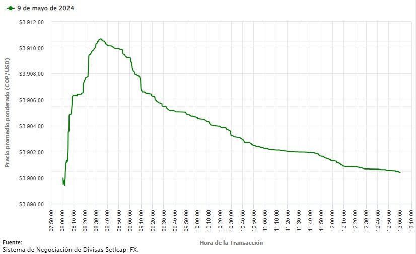 Esta divisa cerró la jornada de este jueves, 9 de mayo, con un valor similar al establecido durante el día anterior; pues se fijó una de cierre de $3.898 COP; sin embargo, tuvo un valor mínimo durante la jornada de $3.891,53 COP y llegó a una equivalencia máxima de $3.918 COP, por lo que la divisa comienza a fluctuar hacia la subida.