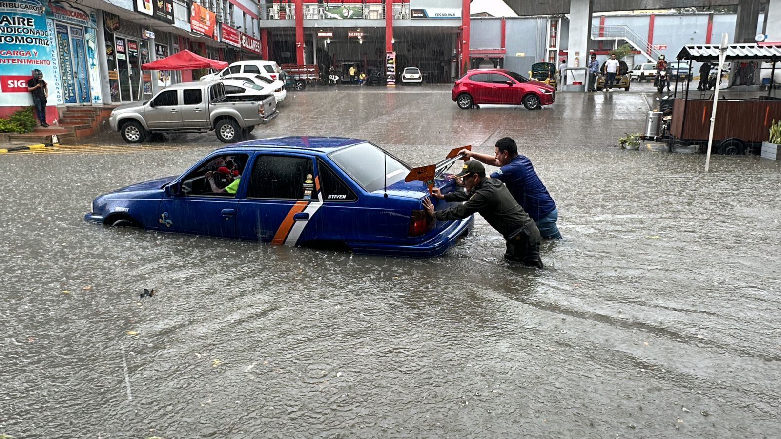 El conductor fue sacado de su vehículo por los valientes policías que estaban en el sector entregando rosas por el Día de la Madre y fue puesto a salvo después del susto en medio del aguacero que generó varias emergencias en Bucaramanga.