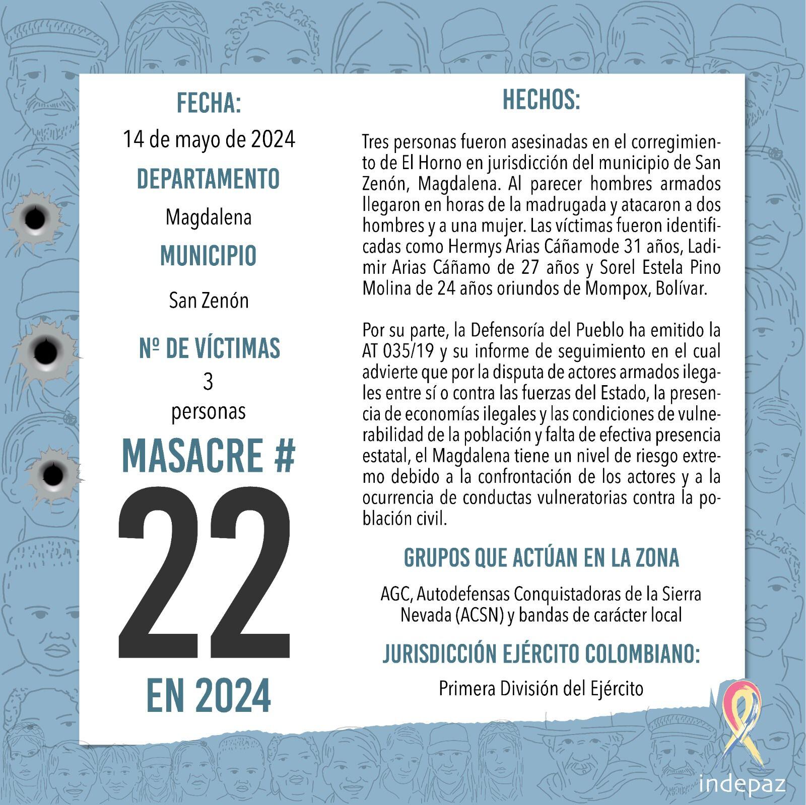 En lo corrido del 2024, esta es la masacre número dos en el Magdalena y la 22 a nivel país, - según defensores de derechos humanos y autoridades judiciales - lo que prende las alarmas entre ciudadanos que piden mayores políticas enmarcadas a mejorar la seguridad en el territorio, máxime cuando en esas zonas del departamento hay presencia de actores armados que se enfrentan entre sí o contra las fuerzas del Estado.