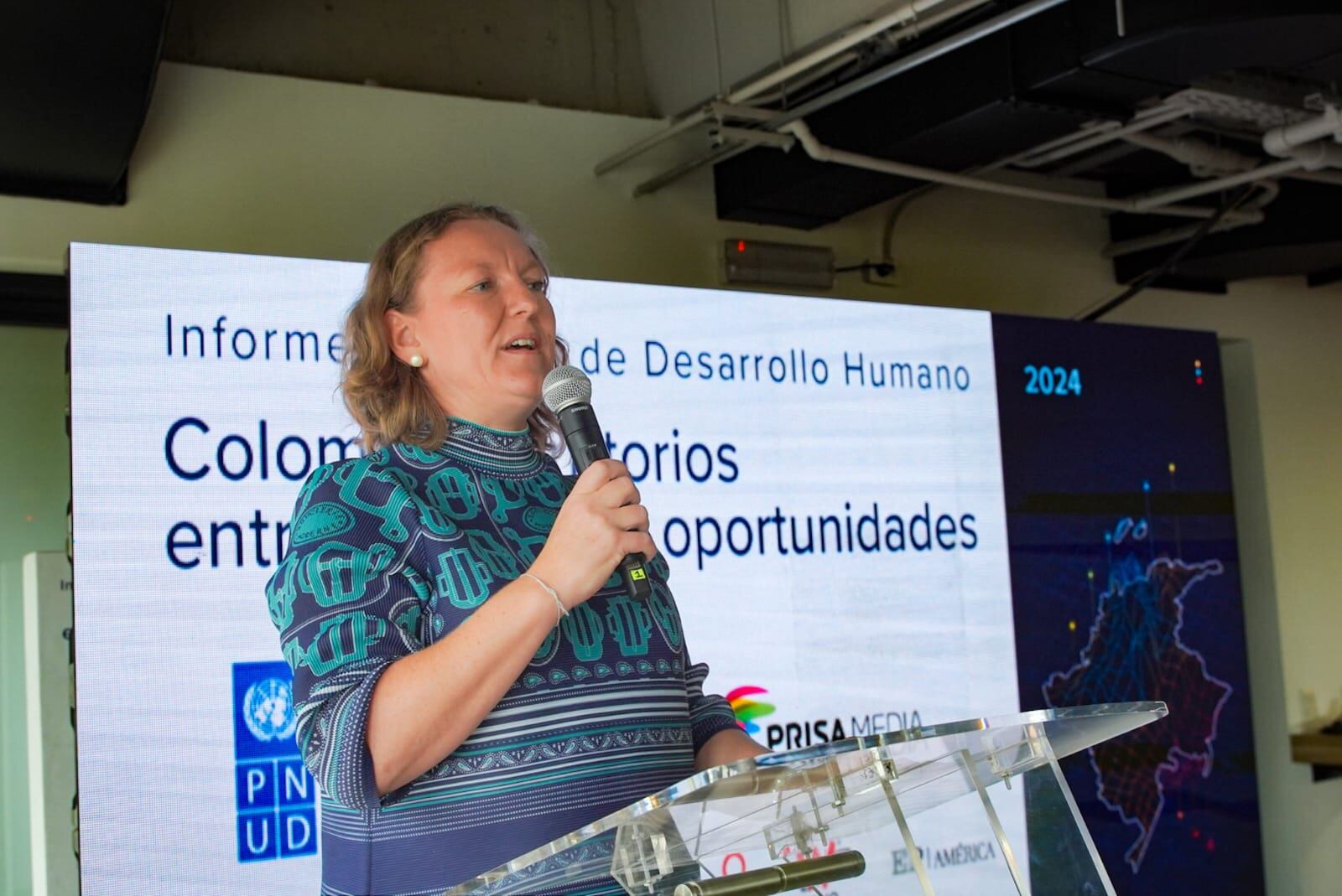 “En las últimas dos décadas, Colombia ha logrado un Índice de Desarrollo Humano alto, avanzando de manera significativa en reducción de la pobreza, cobertura de educación y aseguramiento en el acceso a salud universal. A lo largo del siglo XXI, Colombia también ha sido un líder global en la Agenda 2030, en políticas para la población migrante y de construcción de paz (...) El país avanza en sus promedios, pero no converge en sus territorios”, comentó Sara Ferrer, Representante del PNUD en Colombia.