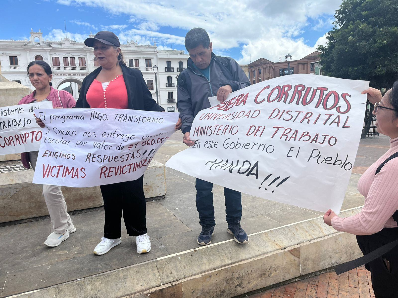 Beneficiarios del programa “Hago transformo y crezco” salieron a las calles para hacer un plantón y reclamar una vez más el cumplimiento de los compromisos de esta iniciativa ejecutada por el Ministerio del Trabajo y la Universidad Distrital Francisco José de Caldas.