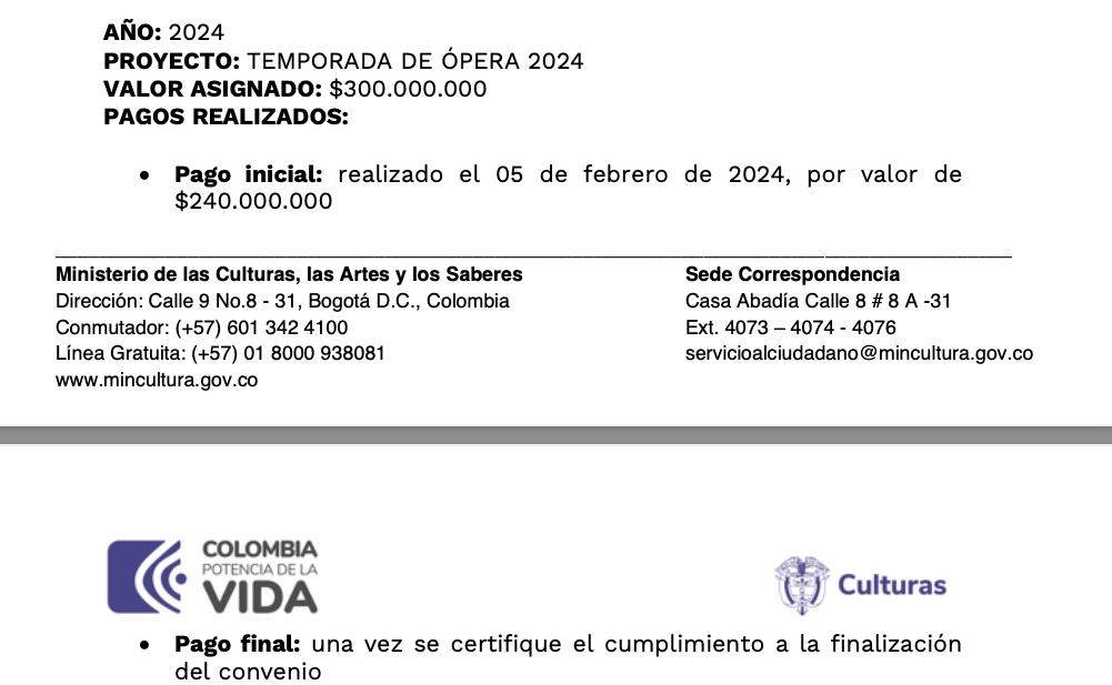 En exclusiva, La W tiene un documento que revela el dinero que recibió la ópera por temporadas desde el año 2021. Por ejemplo, en las obras anteriormente mencionadas se asignaron desde $241.493.000 hasta 300.000.000 millones de pesos y los pagos se han hecho en el tiempo estimado.