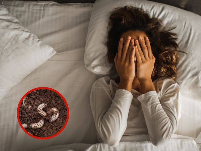 Mujer cubriendo sus ojos mientras está acostada junto a unos gusanos blancos (Fotos vía Getty Images)