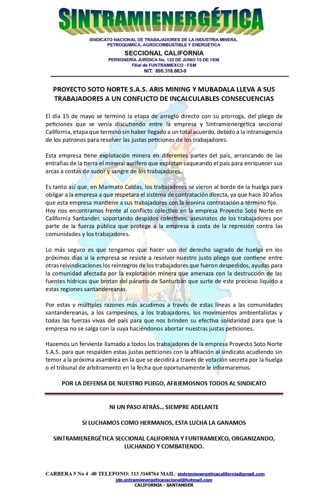“Le exigimos a la empresa Soto Norte Aris Mining y Mubadala resolver las peticiones de los trabajadores que le prestaron el pliego de reclamos. Como el reintegro de 140 trabajadores despedidos en 2021. Consideramos que el beneficio que tiene la empresa de tener los títulos en territorio de California es una riqueza que debe ser compartida” expresó Jorge Lizcano, miembro del Sindicato.