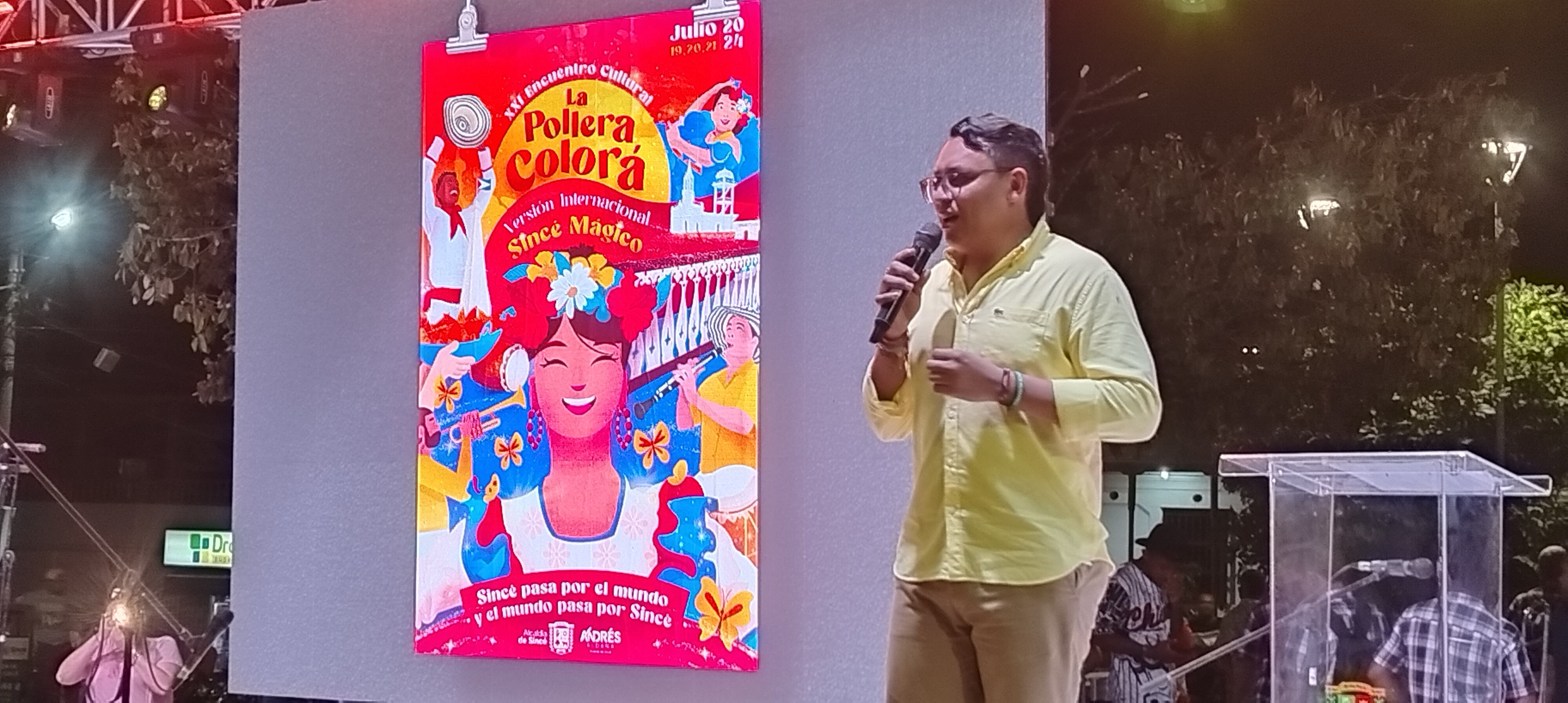 El alcalde de Sincé, Andrés Aldana , hizo el lanzamiento oficial del afiche de la XXI versión del Encuentro Cultural de la Pollera Colorá 2024 que , según dio a conocer, este año tendrá un carácter internacional con invitados de Chile y México.