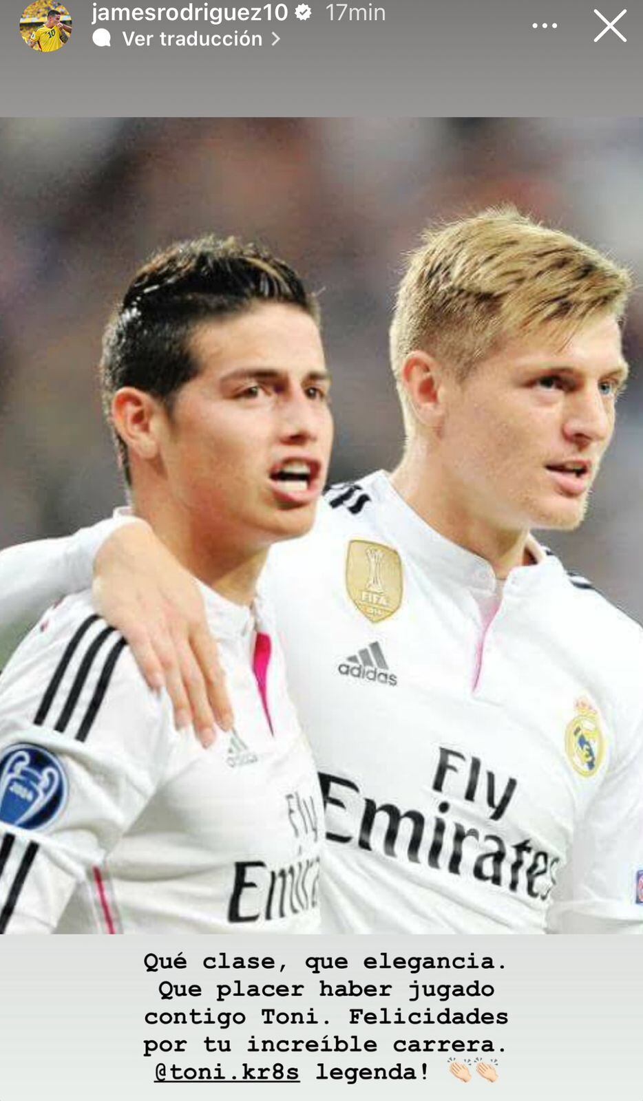 El volante publicó en su cuenta de Instagram: “Qué clase, qué elegancia, qué placer haber jugado contigo, Toni. Felicidades por tu increíble carrera”. El mensaje se encuentra acompañado de una foto de ambos jugadores durante su primera temporada en el Real Madrid.