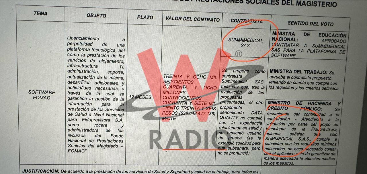 A través de un documento conocido en exclusiva por La W, se conoció que los Ministerios de Educación, de Trabajo y de Hacienda, a través de sus respectivos ministros –Aurora Vergara, Gloria Inés Ramírez y Ricardo Bonilla –dieron su visto bueno para contratar con la firma Sumimedical S.A.S.
