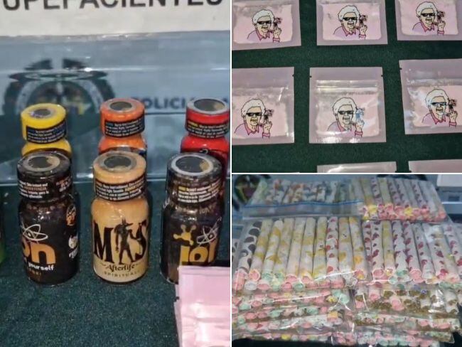 El sujeto portaba exactamente un revólver calibre 38, 400 cigarrillos de marihuana, 160 dosis de cocaína, 67 papeletas de tusi y 13 cilindros de popper.