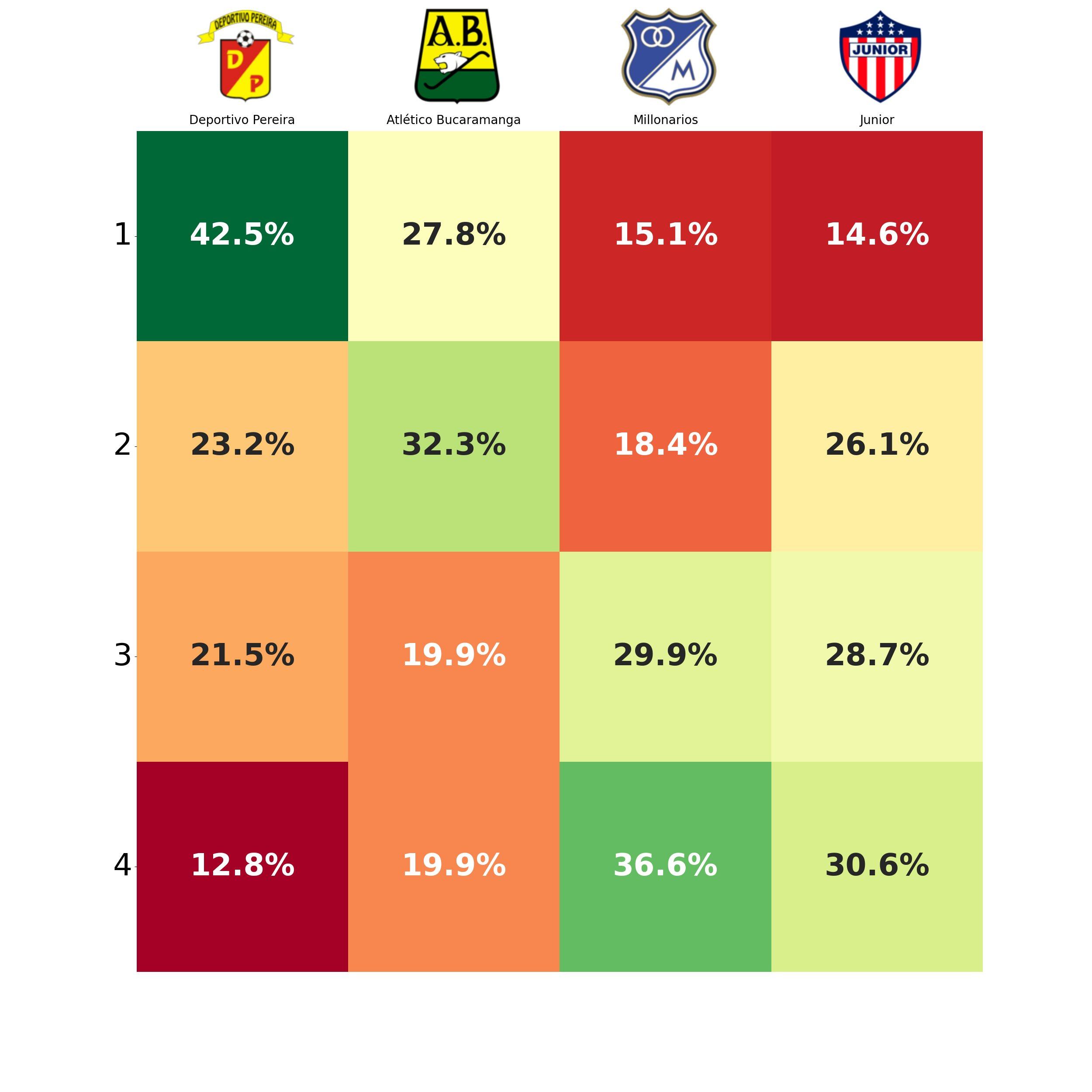 Los equipos que menos posibilidades tienen a nivel de probabilidades son Millonarios y Junior. El cuadro bogotano tiene 15.1% de probabilidad de terminar en el primer puesto del grupo, mientras que el vigente campeón tiene 14.6% de opciones de finalizar como líder y avanzar a la final.