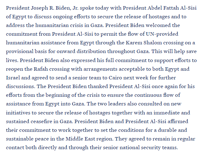 “El presidente Biden celebró el compromiso del presidente al-Sisi para permitir la llegada de la ayuda humanitaria de Naciones Unidas” a través de ese paso fronterizo, señaló un comunicado. “Eso permitirá salvar vidas”, añadió.