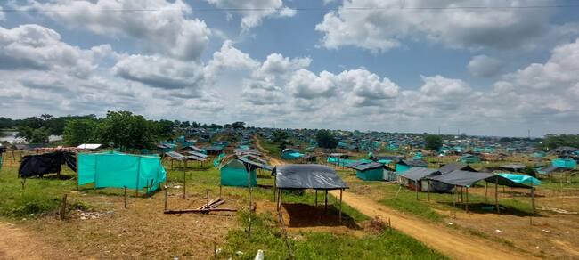 Para quien conoce la municipalidad la invasión o como ellos prefieren llamarle el asentamiento, queda diagonal a la subasta ganadera y a pocas cuadras del comando de la policía de la subregión. Hoy ese caserío tiene un gran número de ranchos levantados, todos con techos de plástico y lonas verdes que por momentos se confunde con la grama. Todos están apuraos a marcar sus casas para que otros no se apropien del terreno y la seña es el nombre y el número de celular en algunos casos. En el lugar hay más de 50 representantes de las comunidades porque cada uno responde por una zona y su orden.