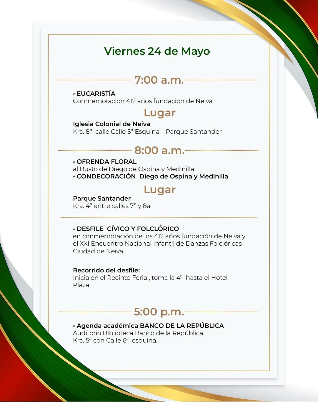 Que este aniversario sea una oportunidad para renovar nuestro compromiso de cuidar y embellecer cada rincón de Neiva, de preservar su patrimonio y de construir un futuro aún más prometedor para las próximas generaciones.