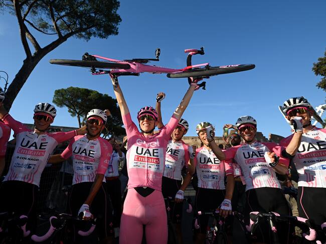 Tadej Pogačarvictoria de Tim Merlier (Soudal Quick-Step) en la etapa 21 de la primera gran vuelta del año, como era de esperarse, el paseo de campeones se llevó a cabo con el protocolario festejo del ganador de la ‘maglia rosa’, Tadej Pogacar, su equipo y los pedalistas que culminaron la justa deportiva.