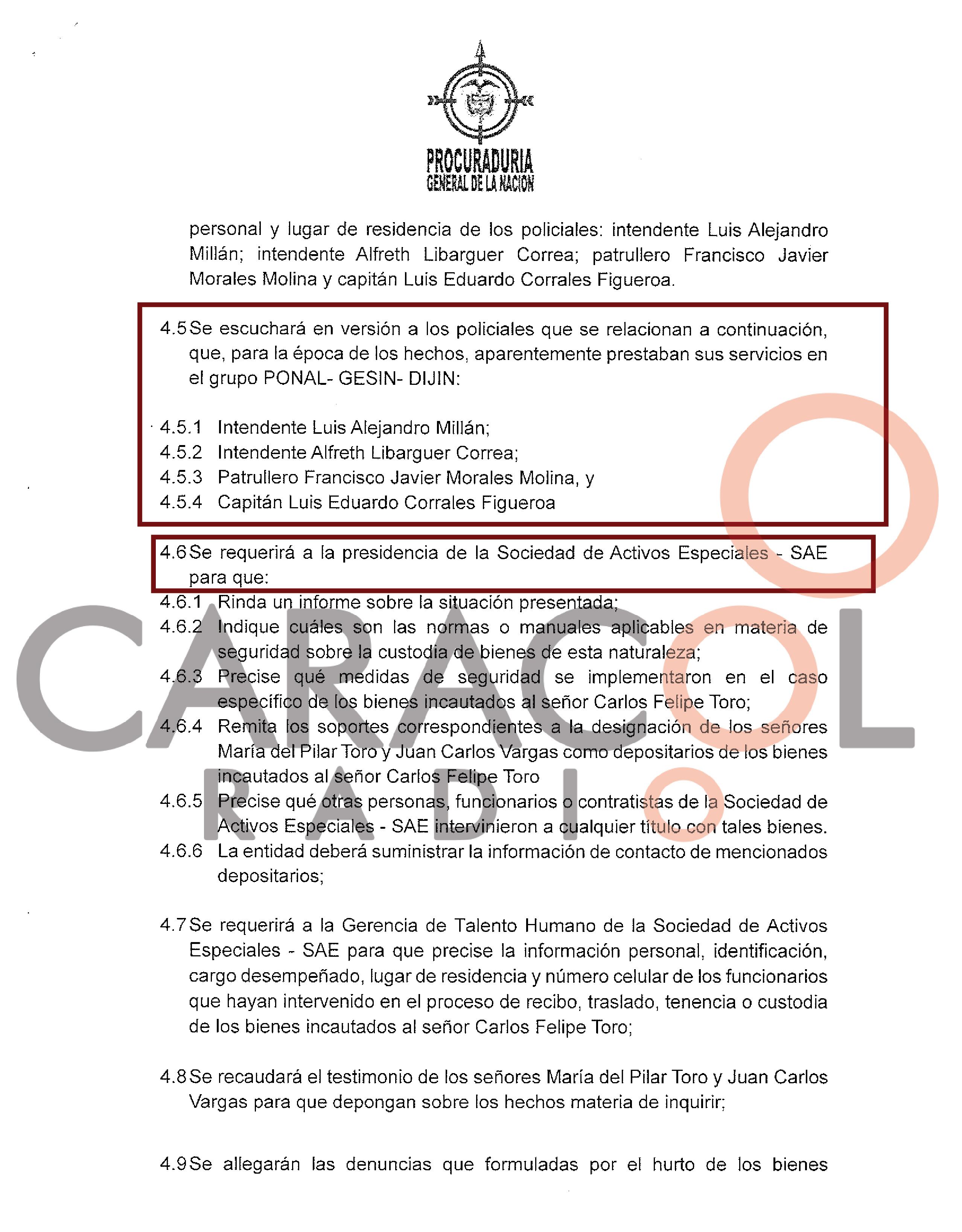 Se ordenó oficiar a la dirección de Talento Humano de la Policía Nacional para que se entregue información de identificación y cita a declarar al intendente Luis Alejandro Millán, al intendente Alfreth Libarguer Correa, patrullero Francisco Javier Morales; y al capitán Luis Eduardo Morales. Todos ellos mencionados en los expedientes de la Fiscalía como presuntos partícipes del cuestionado operativo de incautación.