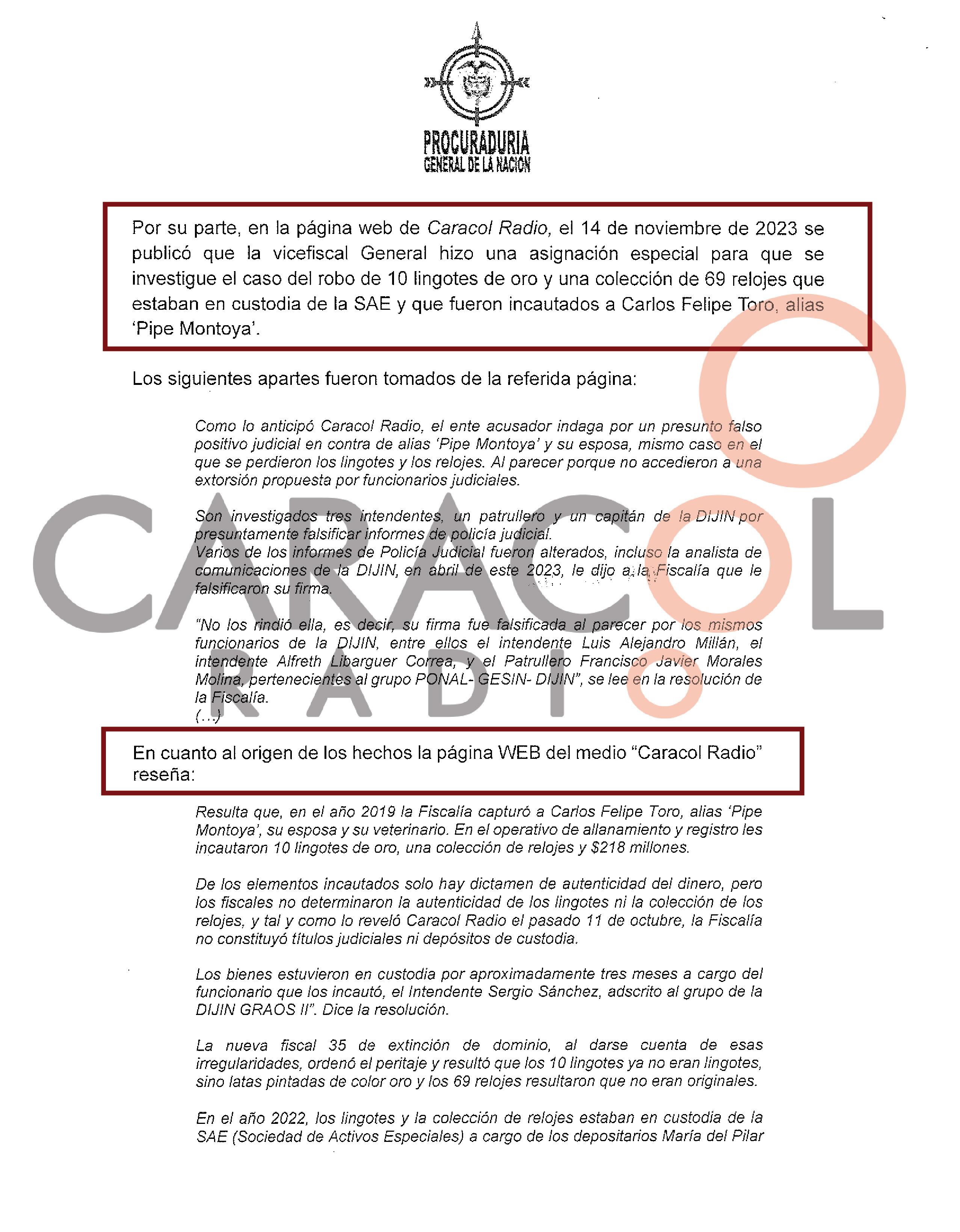 El documento de seis páginas de la Procuraduría dice que abre la indagación disciplinaria a raíz de la publicación que hicimos en Caracol Radio el 14 de noviembre de 2023, y que se tituló “Crece el escándalo de corrupción por el robo de lingotes de oro a la SAE”.