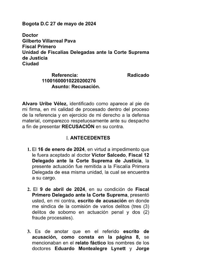 En un documento de 36 páginas, dice que el fiscal Gilberto Villareal, supuestamente tiene comprometida su imparcialidad por su relación cercana con los exfiscales Eduardo Montealegre y Jorge Fernando Perdomo.