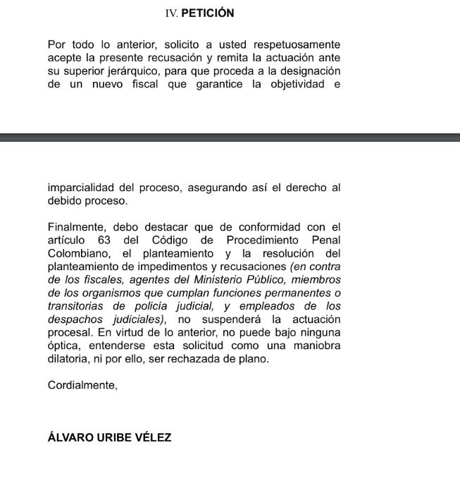 “Solicito a usted acepte la presente recusación y remita la actuación ante su superior jerárquico para que proceda a la designación de un nuevo fiscal que garantice la objetividad e imparcialidad del proceso, asegurando así el derecho al debido proceso”.