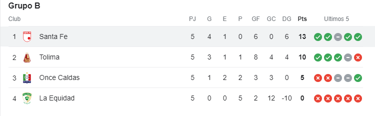 Así quedó la tabla del grupo B tras la victoria de Santa Fe ante La Equidad