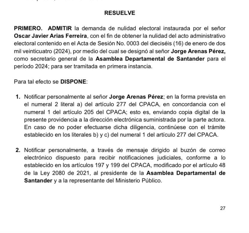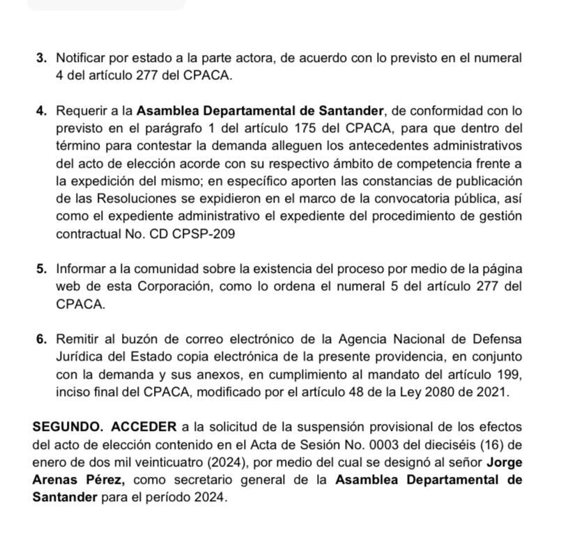La decisión del Tribunal se dio luego de una demanda por la elección del secretario. Según el auto, la Asamblea Departamental de Santander al momento de elegir al secretario general contrató directamente con la Confederación Nacional de Asambleas y Diputados de Colombia (CONFADICOL), entidad que no está calificada como institución educativa ni cuenta con acreditación de alta calidad. De acuerdo con la Resolución No. 148 del 6/12/2023 CONFADICOL fue la entidad que administró la convocatoria pública para la elección del secretario general, además se indicó que Jorge Arenas una vez elegido secretario general de la Asamblea Departamental de Santander para el 2024 fue el supervisor del contrato a través del cual se seleccionó a CONFADICOL para que adelantase la convocatoria pública para el mismo cargo que aspiraba y en el que fue elegido.