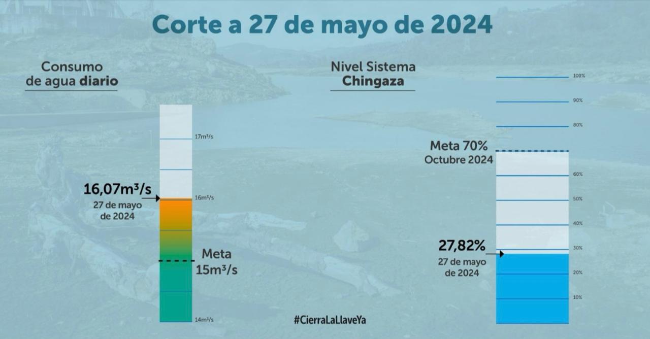 Aunque las lluvias han logrado mejorar el llenado de los embalses de Chuza y San Rafael, que conforman el sistema Chingaza, todavía distan mucho de lo ideal y se debe mantener por ahora el actual esquema de racionamiento de agua. En este sentido, la EAAB informó que a la fecha el nivel de llenado de los embalses de Chingaza se encuentra en 27,55 % y este nivel debe estar a finales del mes de octubre en un 70 %.