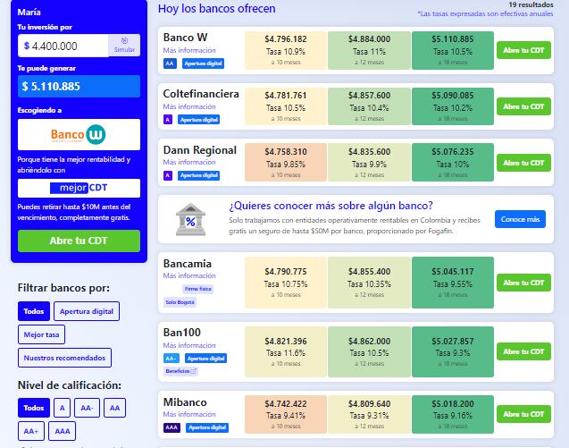 De este modo, nosotros decidimos colocar el valor de 4.400.000 y en distintos bancos el CDT resultaría de la siguiente manera: