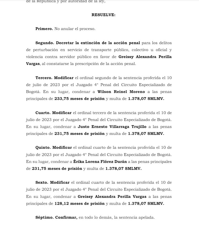 En el caso de Greissy Perilla, Decretó la extinción de la acción penal para los delitos de perturbación en servicio de transporte público, colectivo u oficial y violencia contra servidor público.