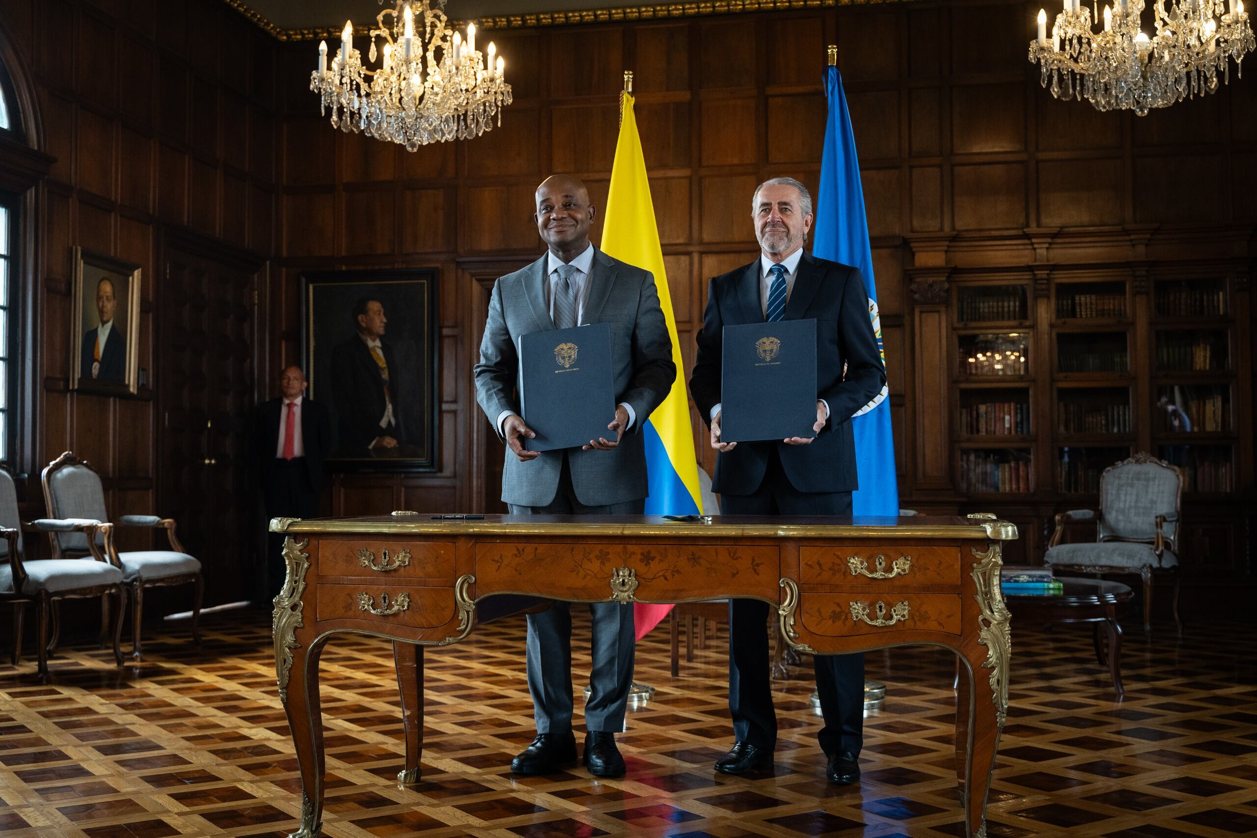 El canciller, Luis Gilberto Murillo, junto con Roberto Menéndez, jefe de la misión de apoyo al proceso de paz en Colombia por parte de la OEA, renovaron este jueves y de manera anticipada, el convenio de acompañamiento al proceso de paz en el país hasta 2027.