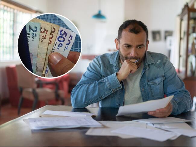 Hombre haciendo cálculos con facturas / Persona contando billetes colombianos de su billetera (Getty Images)