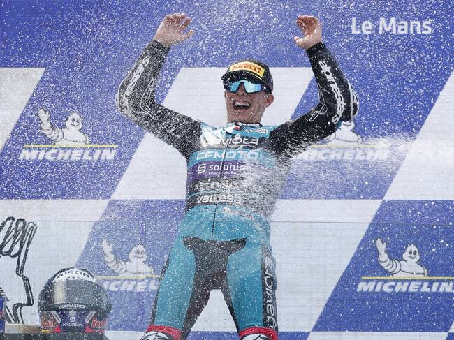 Le Mans (France), 12/05/2024.- Colombian Moto3 rider David Alonso of CFMOTO Aspart Team celebrates on the podium after winning the Moto3 race at the French Motorcycling Grand Prix in Le Mans, France, 12 May 2024. (Motociclismo, Ciclismo, Francia) EFE/EPA/YOAN VALAT / YOAN VALAT (EFE)