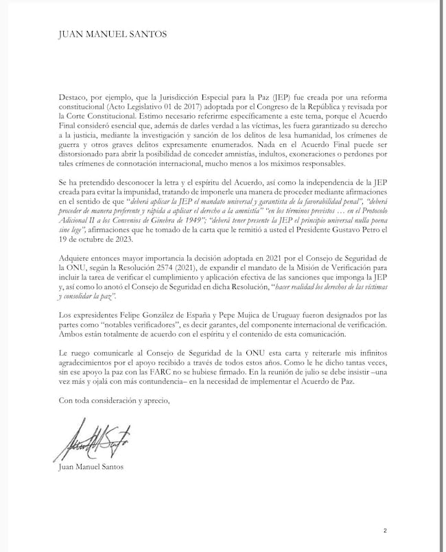El expresidente Juan Manuel Santos reveló en las últimas horas el contenido de una carta que le envió al secretario general de las Naciones Unidas, Antonio Guterres, sobre el acuerdo de paz que él firmó con las Farc y cuya copia está depositada en el Consejo de Seguridad de la ONU.