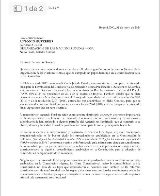 La carta que fue enviada este fin de semana plasma su postura sobre la posibilidad de convocar una Asamblea Nacional Constituyente a través del Acuerdo de Paz del 2016, la tesis que han tenido diferentes funcionarios del gobierno, entre ellos el presidente Gustavo Petro y el excanciller Álvaro Leiva.