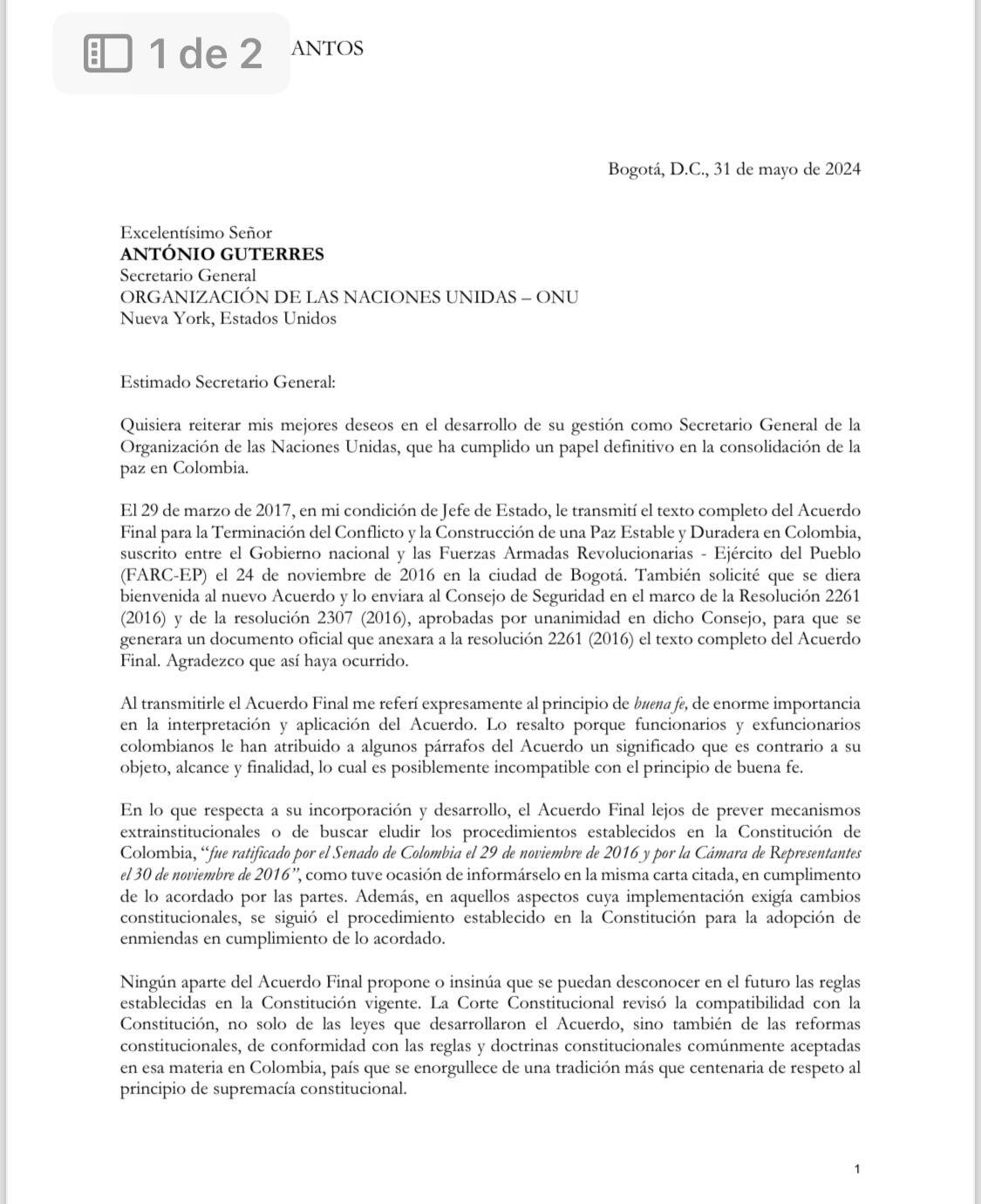 La carta que fue enviada este fin de semana plasma su postura sobre la posibilidad de convocar una Asamblea Nacional Constituyente a través del Acuerdo de Paz del 2016, la tesis que han tenido diferentes funcionarios del gobierno, entre ellos el presidente Gustavo Petro y el excanciller Álvaro Leiva.