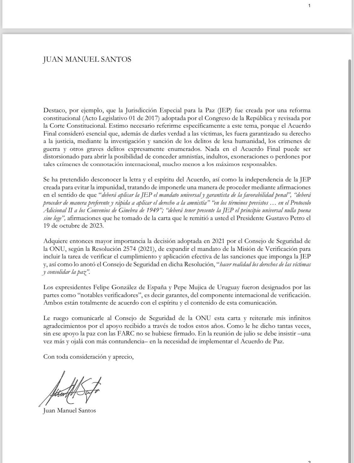 El expresidente denunció que funcionarios y exfuncionarios le han atribuido algunos párrafos al Acuerdo de Paz contrario a su objeto y han pretendido incluso desconocer la letra y el espíritu del acuerdo, así como la independencia de la Jurisdicción Especial de Paz. En este documento, el expresidente dice que al transmitirle el acuerdo final a la ONU, se refirió expresamente al principio de buena fe, de enorme importancia en la interpretación y aplicación del acuerdo, pues aquellas personas que están intentando convocar una asamblea están violando este principio.