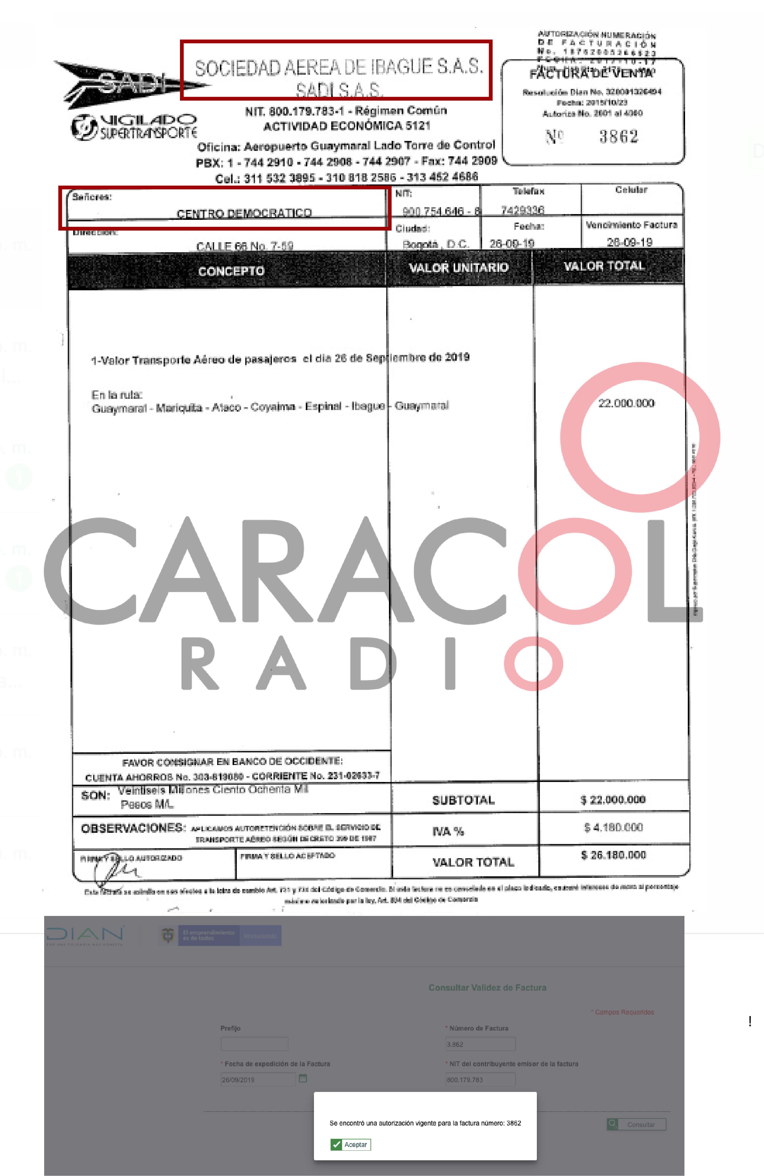 La factura 3862 del 26 de septiembre de 2019, por pago de contado, de 26 millones 190 mil pesos a nombre del Centro Democrático, corresponde al transporte de pasajeros del mismo día 26 de septiembre de 2019 en la ruta Guaymaral-Ataco-Coyaima-Espinal-Ibagué-Guaymaral. ((VER DOCUMENTO))