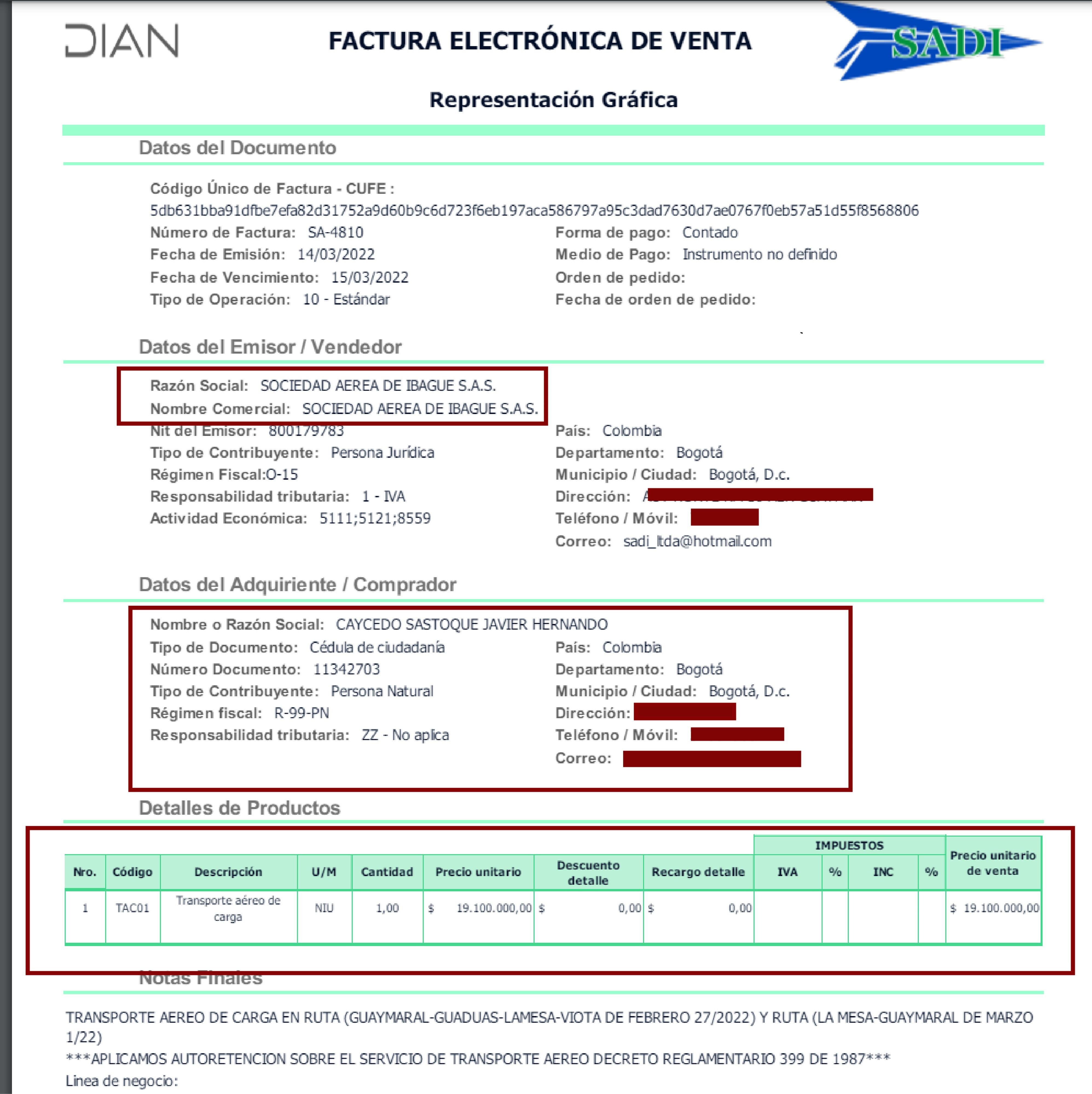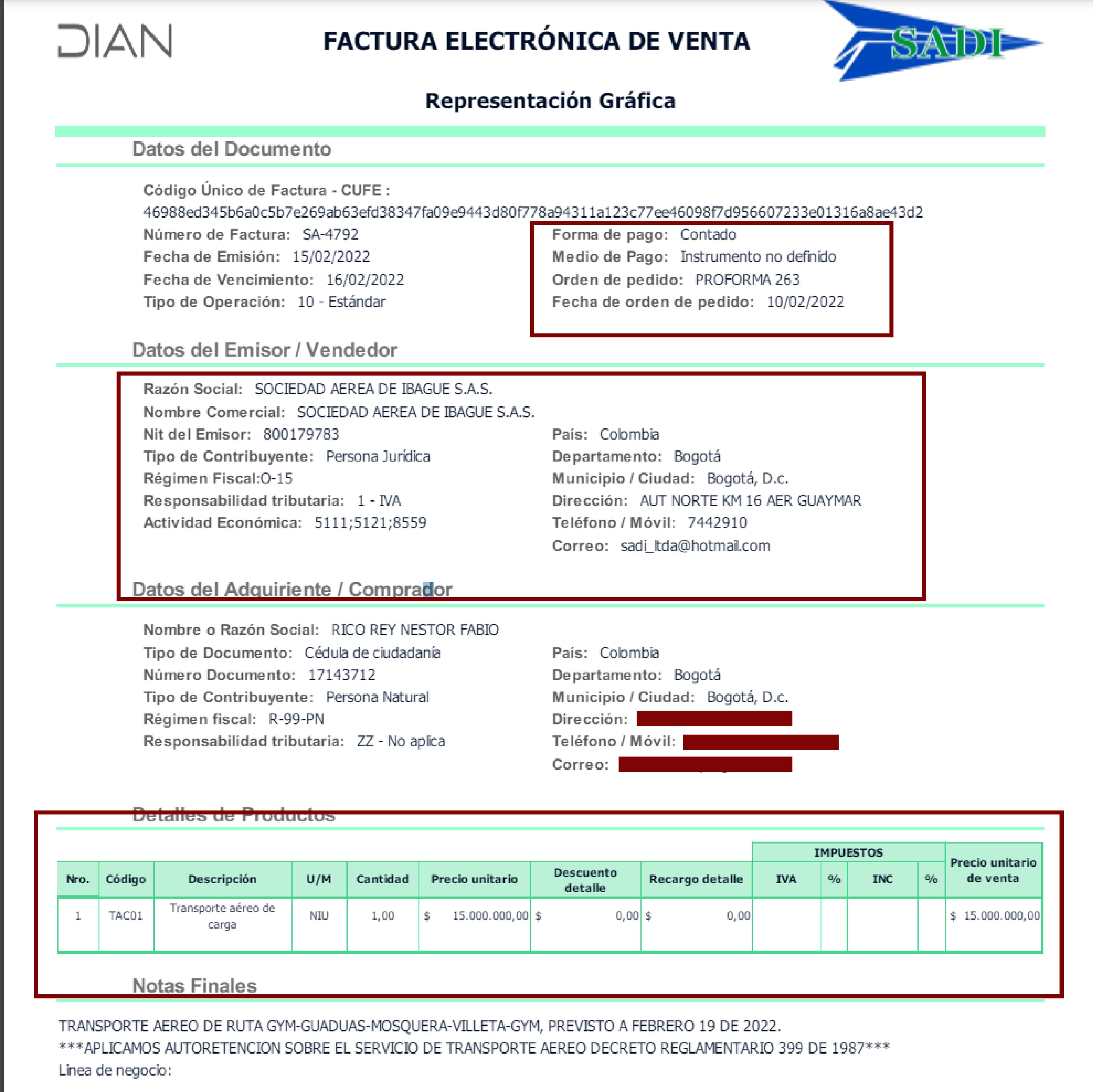 La factura electrónica SA-4792 del 15 de febrero de 2022, por pago de contado de 15 millones de pesos está a nombre de Nestor Fabio Rico Rey, quien fue candidato a la alcaldía de El Rosal por la alianza entre el partido Liberal, el partido Conservador y Cambio Radical. La factura dice que se prestó transporte de carga en la ruta Guaymaral-Guaduas-Mosquera-Villeta-Guaymaral el 19 de febrero de 2022. Según esto fue un pago de contado y anticipado al vuelo que se realizó. ((VER DOCUMENTO))