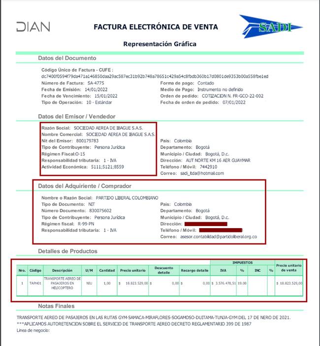 La factura electrónica SA-4775, del 14 de enero de 2022, soporta el pago de contado por 18 millones 823 mil 529 pesos, a nombre del Partido Liberal Colombiano, por transporte de pasajeros en Helicóptero. En la factura se describe que los servicios aéreos cubrieron la ruta Guaymaral-Samacá-Miraflores-Sogamoso-Duitama-Tunja-Guaymaral el 17 de enero de 2021. Es decir, el partido liberal pagó con un retraso de un año o hubo un pequeño error en la fecha por el cambio de año. ((VER DOCUMENTO))
