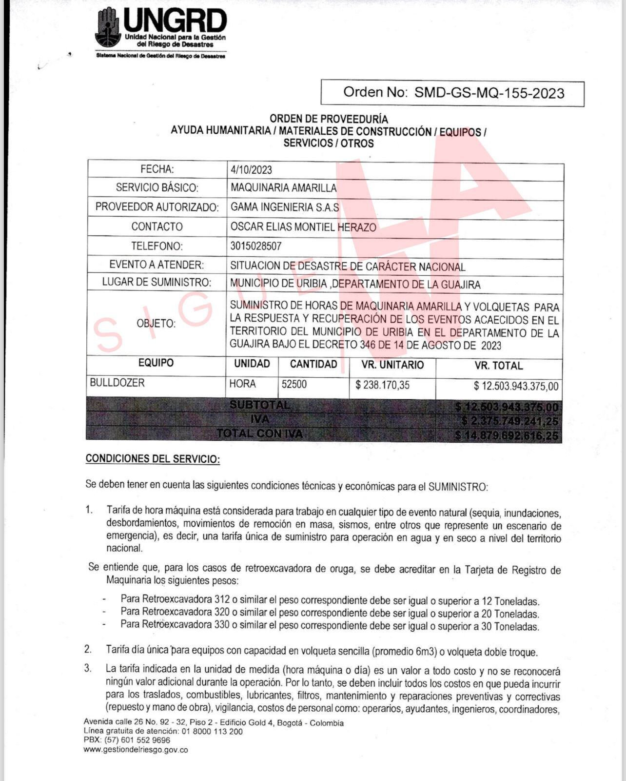 Así, este es el recibo que emitió OCC S.A.S donde se evidencia que el contrato fue por $4.500 millones de pesos para la limpieza de jagüeyes en el municipio de Uribia: